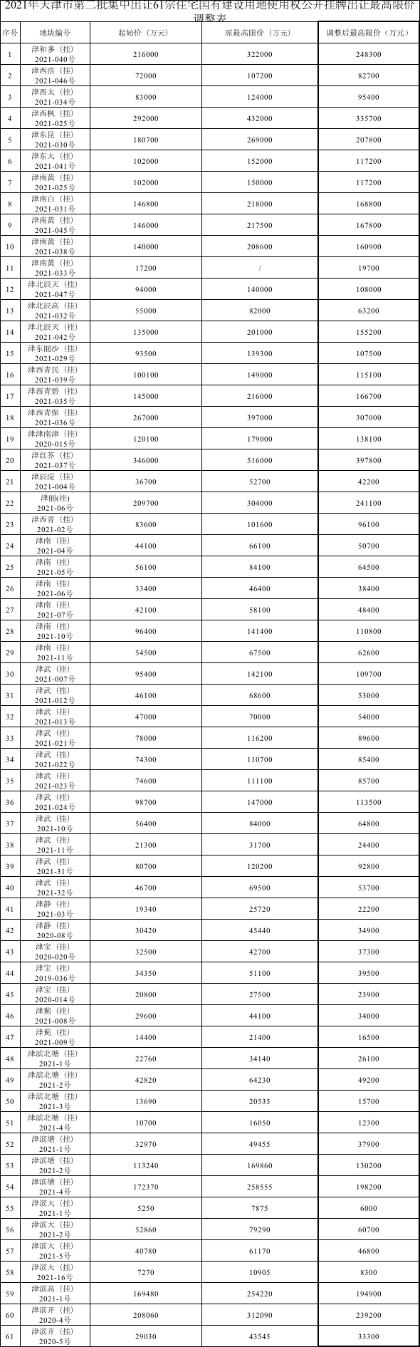 此外,公告称,单宗住宅用地达到较高限价后,采用摇号方式确定竞得人,摇号的具体时间和操作程序另行通知,并对61宗地块的较高限价进行了调整。