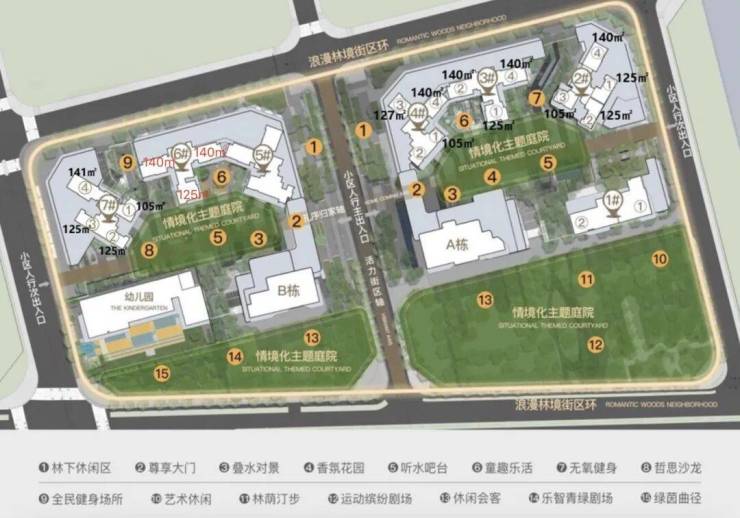 共9栋,其中7栋住宅,2栋类住宅公寓,一所6班幼儿园,一所2班托儿所,小区主出入口设底层商铺,绿化率≥30%,小区南向2个开发商代建公园。