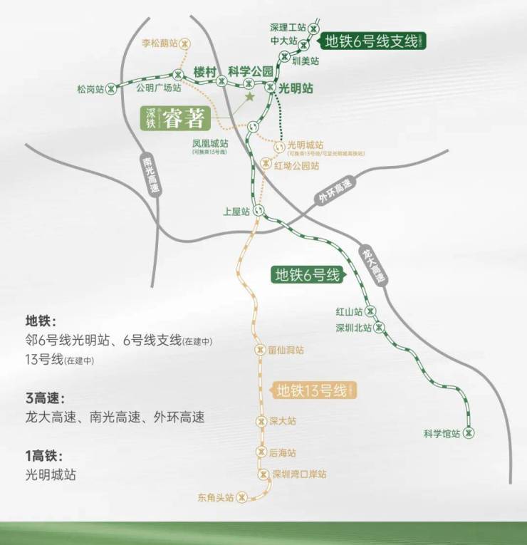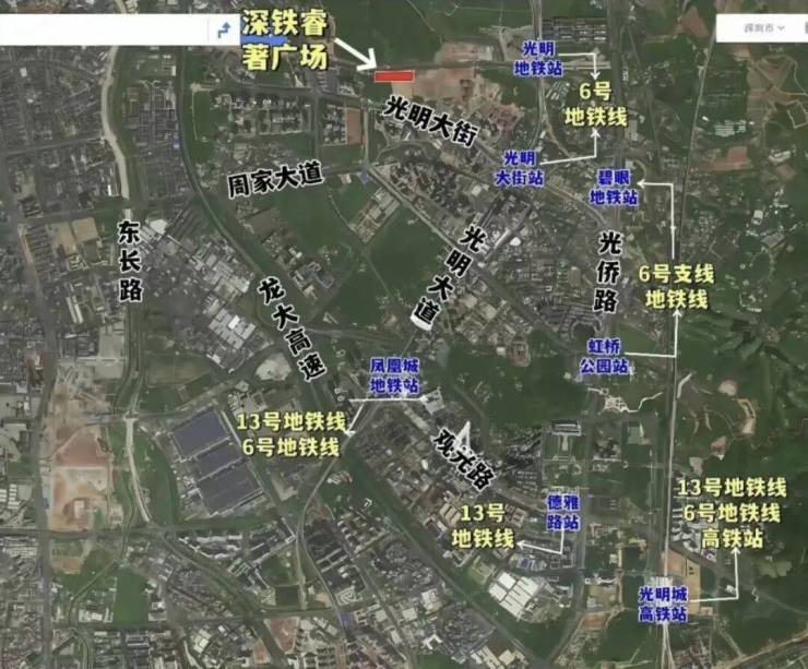 轨道交通:距离6号线光明站约1公里,两个站达凤凰城站可换成13号线(在建中),6号线支线二期直达光明高铁站