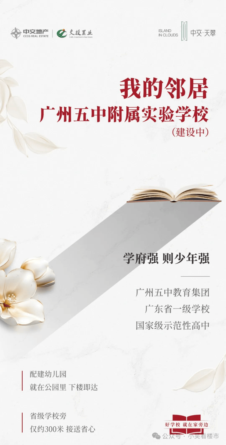 项目自身只配建了一所9班的幼儿园,没有小学,隔壁馥香园配建了24班的小学,并且已经官宣引入广州五中附属实验小学,按照控规文件显示,学校对应的AH101324地块,距项目仅约300米距离,符合小学生居住地与学校距离3公里内的就近入学原则,而且天翠也官宣了,小区会对口该校!