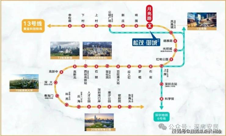 目前距离在建的13号地铁线“月亮路站”约400米,3站到光明城站,5站到石岩上屋站,计划在2025年通车运营。