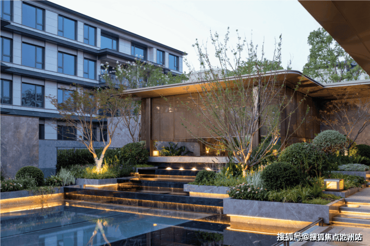 中央水景联动地面景观及地下会所空间,通过三层叠水形成了特色鲜明的水景庭院,引领未来社区发展新趋势。