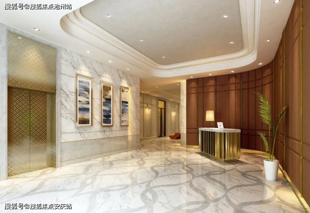 滨江一品苑的7米高入堂大厅。所有户型的厅、堂、卧室均采用落地观景窗,以保证充分采光及大面积景观视野。