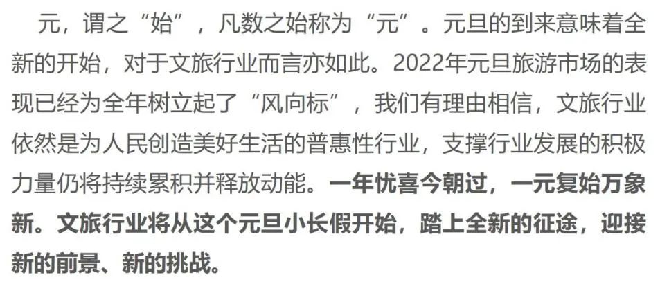 本周,2022年元旦小长假如约而至。在这个元旦假期,跨年游和季节游成为较具代表性的两大出游方式,而文旅行业“元气满满”的精气神依然清晰可见。一年忧喜今朝过,一元复始万象新。文旅行业将从这个元旦小长假开始,踏上全新的征途,迎接新的前景、新的挑战。