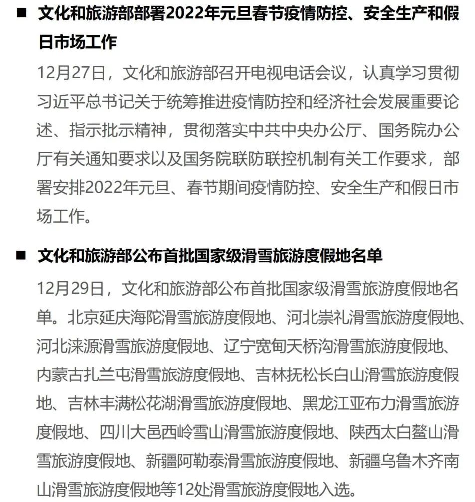 本周,文化和旅游部公布首批高级滑雪旅游度假地名单,北京延庆海陀滑雪旅游度假地、河北崇礼滑雪旅游度假地、吉林丰满松花湖滑雪旅游度假地等12处滑雪旅游度假地入选。高级滑雪旅游度假地的创建,将是引领冰雪旅游产业迈向规范化、国际化、低碳化的重要工作,并为北京冬奥会及未来奥运文化的弘扬提供更坚定的文化自信、更好的发展空间。