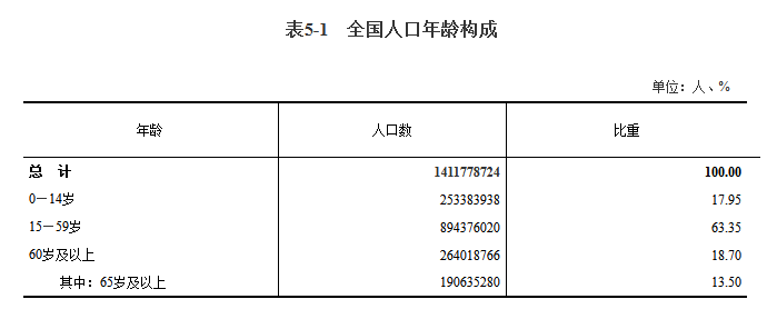 2020年,0—14岁人口为25338万人,占17.95%;15—59岁人口为89438万人,占63.35%;60岁及以上人口为26402万人,占18.70%(其中,65岁及以上人口为19064万人,占13.50%)。
