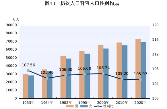 2020年男性人口为72334万人,占51.24%;女性人口为68844万人,占48.76%。总人口性别比(以女性为100,男性对女性的比例)为105.07,与2010年基本持平,略有降低。出生人口性别比为111.3,较2010年下降6.8。我国人口的性别结构持续改善。