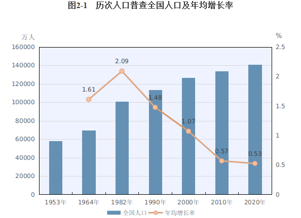 第七次全国人口普查结果出炉,全国人口共14.1178亿人,年平均增长率为0.53%,比2000年到2010年的年平均增长率0.57%下降0.04个百分点。