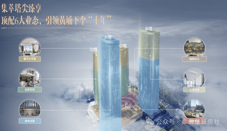 项目概况:位于黄埔科学城核心,21号线神舟路站地铁上盖。占地约4.6万方,总建面积约41万㎡,涵盖奢华大平层、创享空间、超甲办公、独栋办公、旗舰商业及五星级标准云澜酒店等6大业态,打造事业、生活交融的一站式都会生活圈。