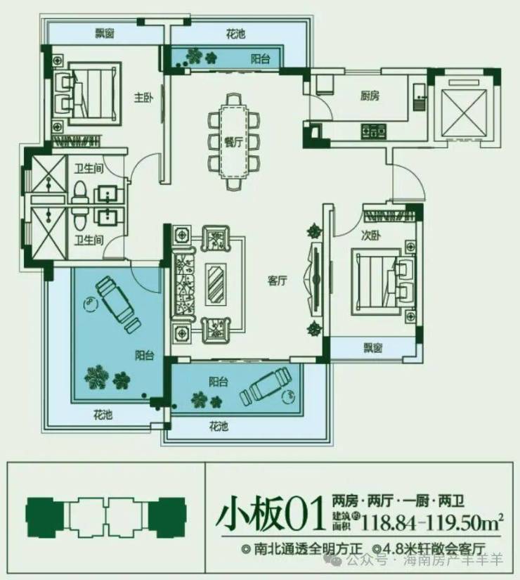建面约118㎡,2房2厅1厨2卫