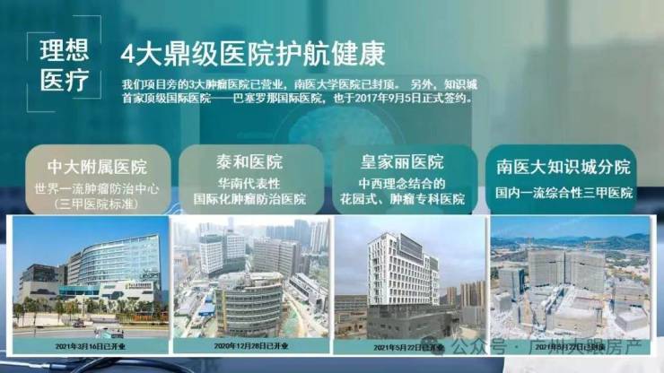 附近有中山大学附属肿瘤医院华南医院(三甲医院标准)、广州泰和肿瘤医院,广州皇家丽肿瘤医院,南方医科大学南方医院、巴萨罗那医院等优质医疗配套