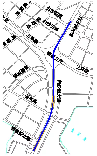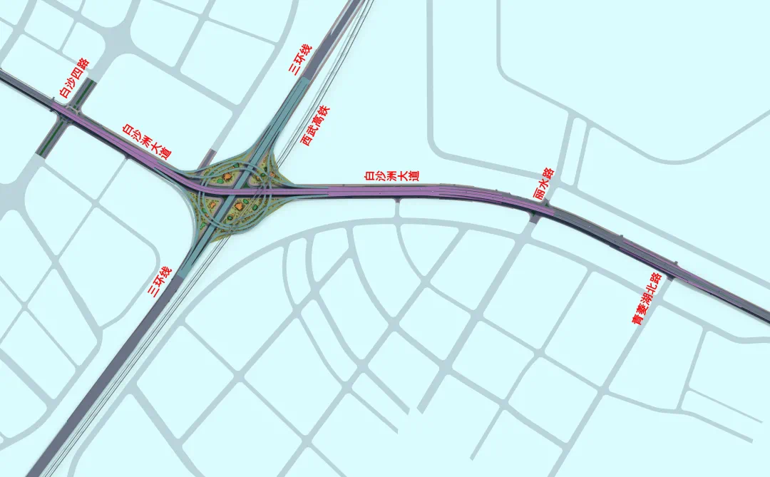 ● 北起白沙四路,南至青菱湖北路,跨越白沙四路、三环线及青菱立交匝道、丽水路、青菱河,下穿待建西武高铁。