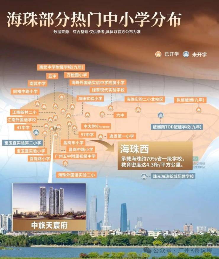 项目位于海珠区最强教育板块之一,根据海珠区教育局公布《2024年海珠区公办小学招生服务地段表》:中旅天宸府所属沙园街橡胶新村社区,约500米直距昌岗中路小学,符合就近入读条件。