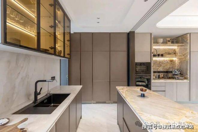 公区排场已极尽铺陈,室内精装自然也要拉满,目之所及的嘉格纳厨电、当代和劳芬卫浴,大理石景墙与玉石岛台(除约170㎡),全是交标。