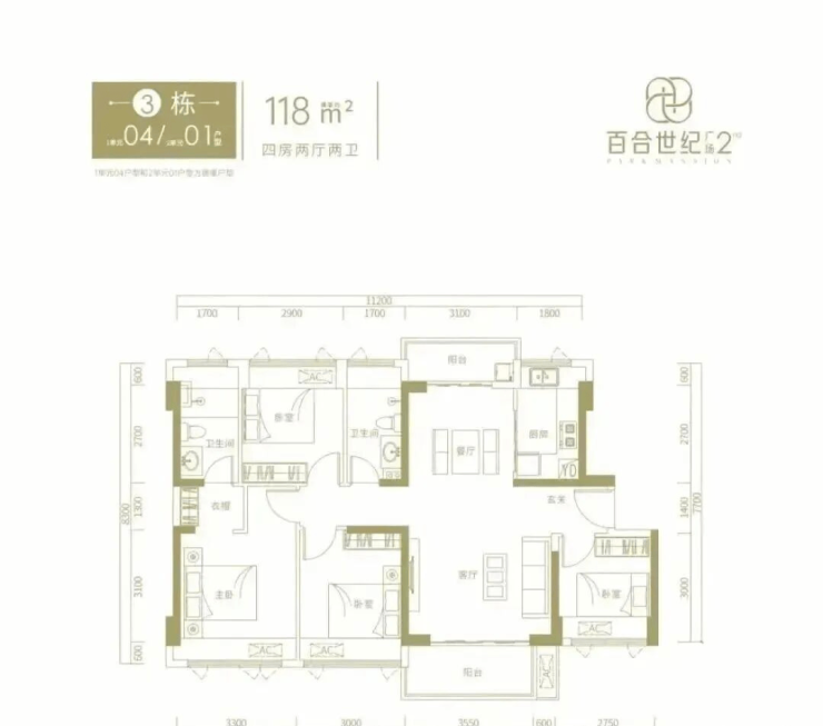 118㎡的4房2厅2卫,3栋1单元04/3栋2单元01户型,设计的是竖厅南北通透格局,进门入户玄关,客厅4.15米开间,客餐厅分离设计,南北双阳台,得房率约76%(不含赠送),阳台主朝西南或东南向。套内面积89.68㎡+赠送15.44㎡=105.12㎡,加上赠送得房率约89.08%。