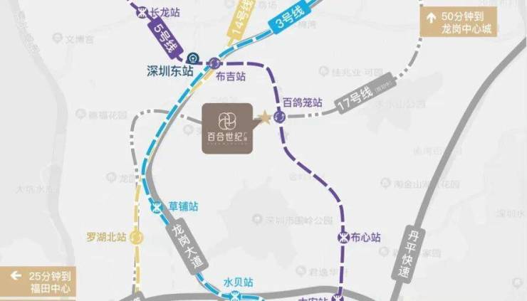 项目紧邻地铁5号线百鸽笼站,步行约100米,1站可换乘3/14号线,4站直达福田核心区,7站可达深圳北站。此外,周边1公里接驳龙岗大道,2.5公里直达丹平快速,自驾可快速通勤全城。