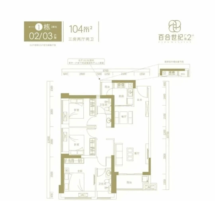 104㎡的3房2厅2卫,1栋02/03户型,设计的是竖厅格局,客厅3.6米开间,LDKB一体化设计,三开间朝南,动静分区,得房率约76%(不含赠送),正南朝向。套内面积79.04㎡+赠送10.31㎡=实得89.35㎡,加上赠送得房率约85.91%。