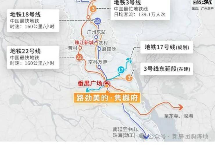 项目距离最近的地铁站 3 号线番禺广场站约 800-900 米,这里是 4 条地铁的交汇点,分别为 18 号线、22 号线、3 号线