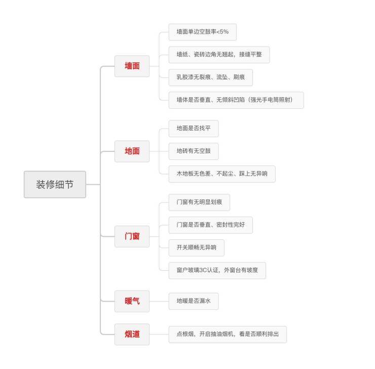 墙面、地砖、门窗、暖气等装修细节都要仔细检查。