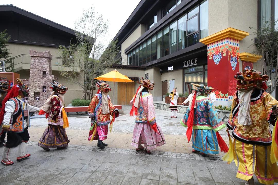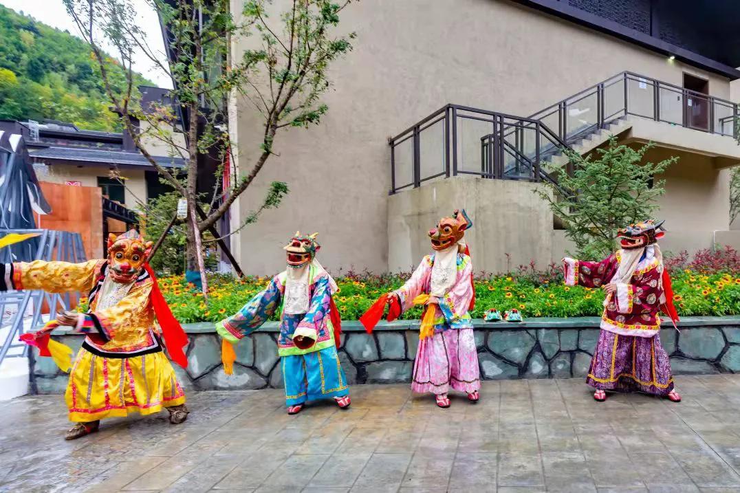 △㑇舞是白马人的传统舞蹈,体现了白马人对大自然的崇拜。图为四川文旅大会期间,九寨鲁能胜地组织㑇舞的表演。