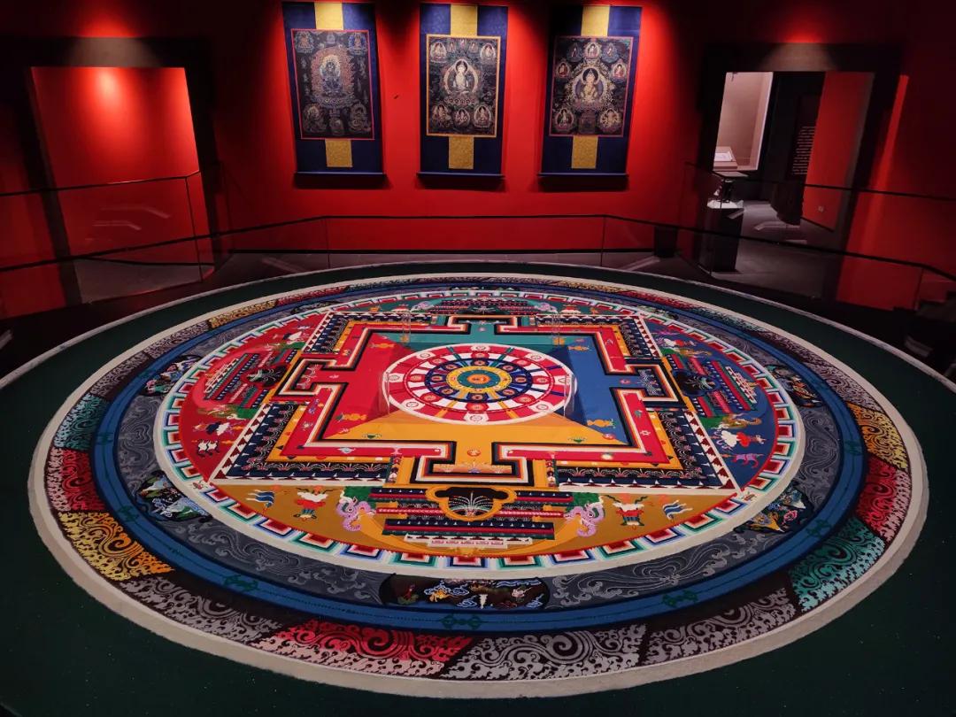 △坛城沙画是由极细的沙粒堆砌成立体的画作,过程可持续数日甚至数月。图为九寨藏羌非遗博物馆内保留的一副完整大型坛城沙画。
