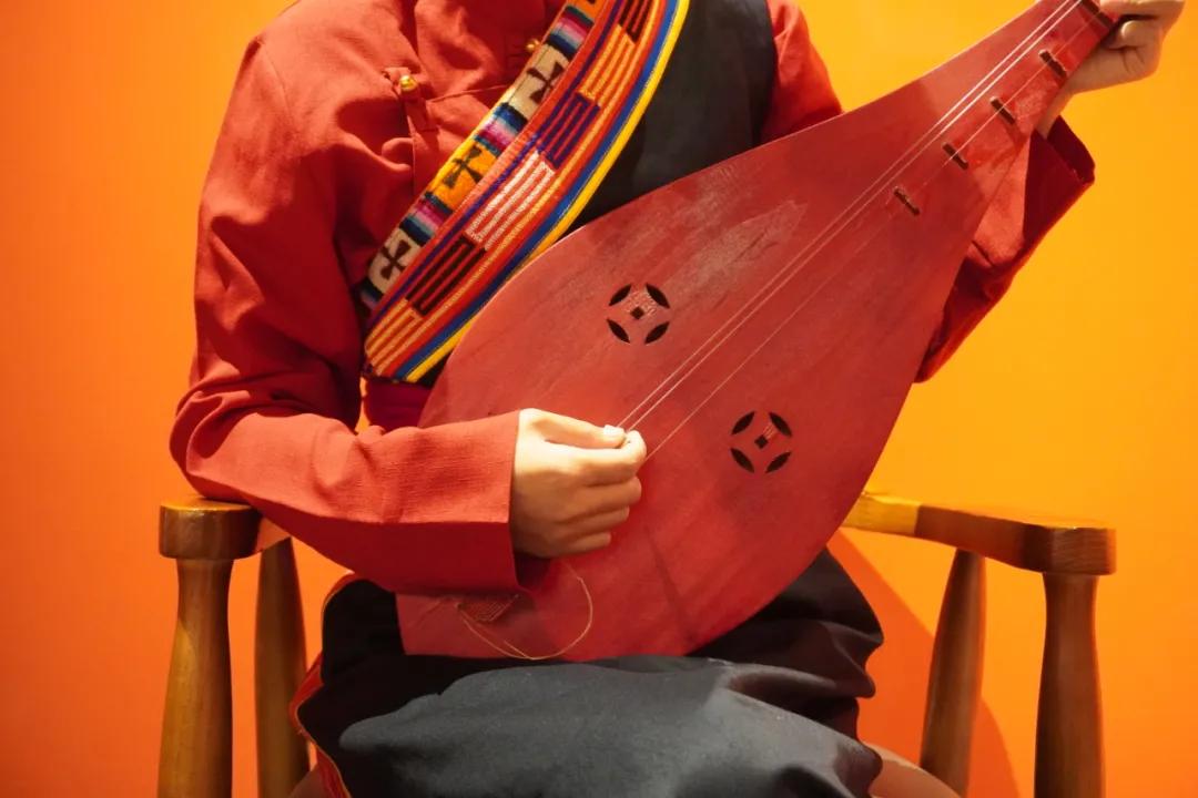 △图为在九寨藏羌非遗博物馆工作的藏族姑娘展示南坪琵琶弹奏技艺。