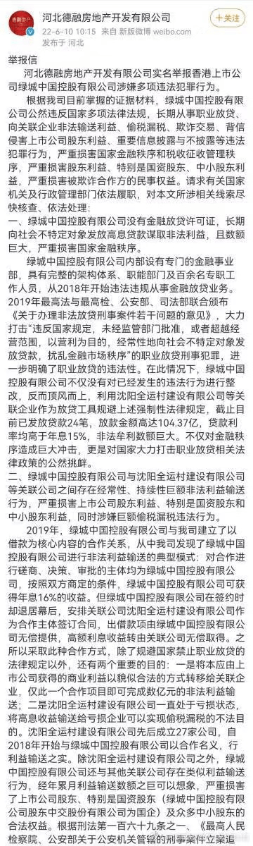 6月10日,河北德融在举报信中称,根据我司目前掌握的证据材料,绿城中国控股有限公司公然违反国家多项法律法规,长期从事职业放贷、向关联企业非法输送利益、偷税漏税、欺诈交易、背信侵害上市公司股东利益、重要信息披露与不披露等违法犯罪行为。