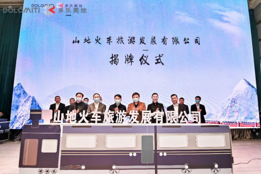 崇礼区委常委、常务副区长张树峰先生;张家口市冬奥办保障部部长、崇礼区委常委、政府副区长曹建伟先生;中车产业投资有限公司党委书记、董事长胡洋先生;宁波中车股权投资基金管理有限公司总经理毕晓露先生及山地火车旅游发展有限公司董事长柏松女士共同为山地火车旅游发展有限公司揭牌。