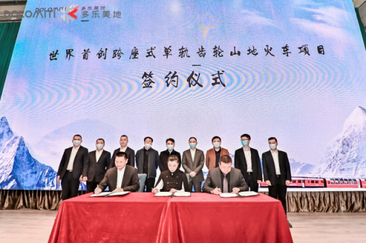 张家口崇礼区体育文化传媒有限公司董事长刘珠先生、株洲中车特种装备科技有限公司总经理顾发根先生与山地火车旅游发展有限公司董事长柏松女士,共同签署了“世界首创跨座式单轨齿轨山地火车项目”协议书。