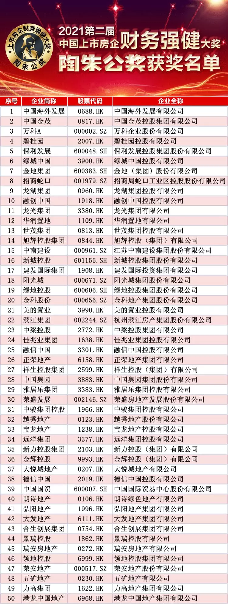 以下为2021第二届中国上市房企财务强健大奖“陶朱公奖”50家获奖企业名单: