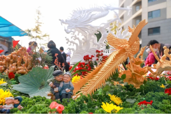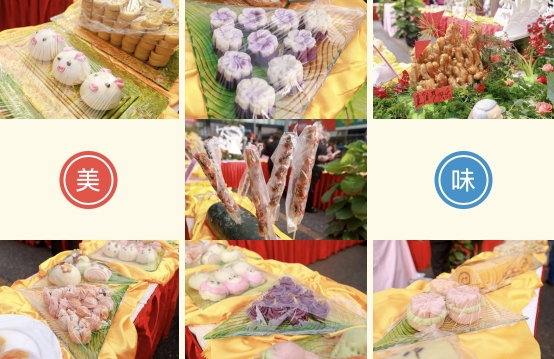 在金手杖一层的街区,七十几种小吃沿街叫卖,有"北京美食代表"烤鸭,传统京味点心牛舌饼、萨其马、自来红、自来白,软糯清甜的甑糕、驴打滚,冰糖葫芦等……特别值得一提的是,金手杖膳食团队精心雕刻的龙凤,须毫可见,细致入微,满载着对老人们的祝福。