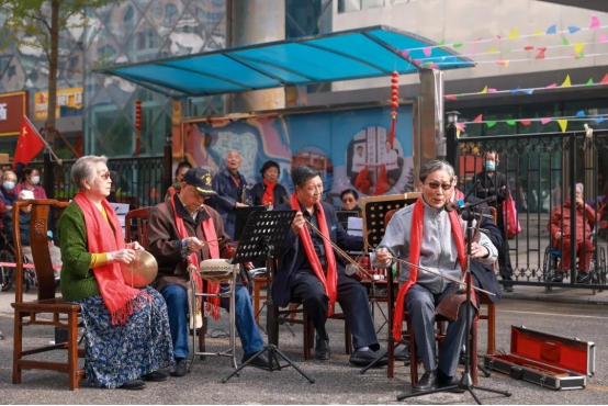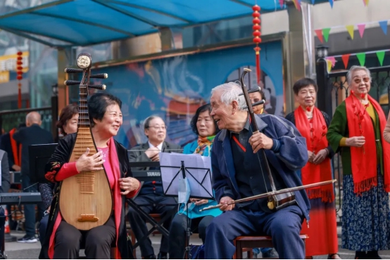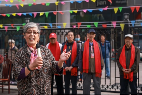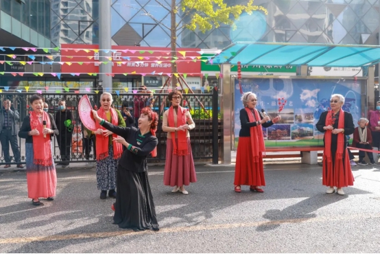 来自金手杖"悦秀队"和"快乐舞蹈队"的老师,精心为此次重阳活动编排了节目——旗袍秀《水墨兰亭》和舞蹈《月光下的凤尾竹》、《南水湖之恋》。合唱队的几位阿姨身着红裙,手里擎着红梅,唱出铿锵戏腔;伴舞的阿姨手摇一把折扇,身段款款演绎出革命英雄的女子柔情。