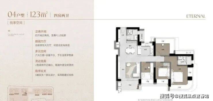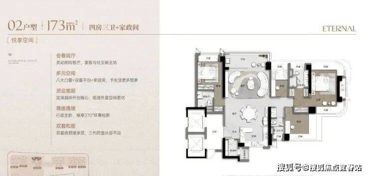 173m²的4房2厅3卫+家政间,设计的是竖厅类双龙抱珠格局,独立电梯厅入户约8.13㎡,客厅5.55米开间,LDKB一体化设计,主卧套房270°环幕凸窗+私享阳台,八大凸窗+设备平台+家政间,分别做到了主卧27.1㎡/次卧14.87㎡/次卧12.38㎡/次卧8.38㎡/家政间2.93㎡+阳台1.38㎡(实测面积,去掉墙体),U型厨房,公卫三段式干湿分离,得房率超90%(包含赠送),阳台9.56㎡正北朝向,看会展中心+市民广场。
