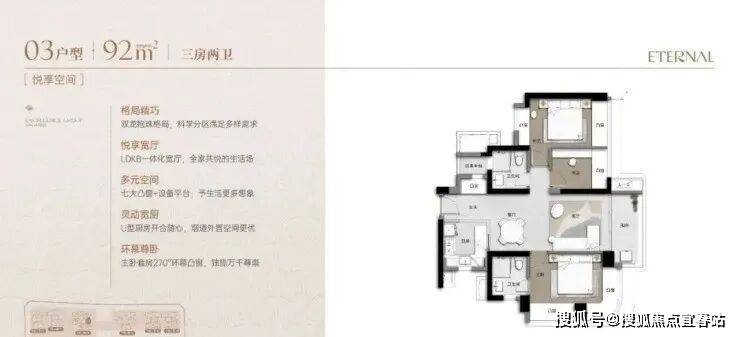 92m²的3房2厅2卫,设计的是双龙抱珠格局,客厅3.2米开间,LDKB一体化宽厅,主卧套房270°环幕凸窗,七大凸窗+设备平台,分别做到了主卧16.06㎡/次卧12.82㎡/次卧6㎡(实测面积,去掉墙体),U型厨房,卫生间干湿分离,得房率超90%(包含赠送),阳台实测6.54㎡正东朝向。