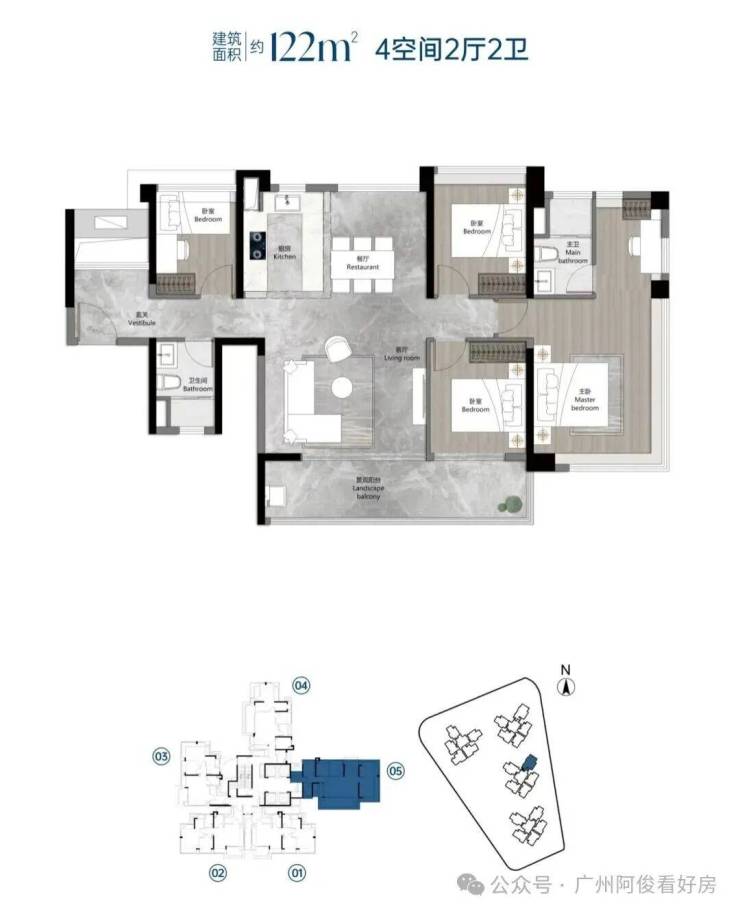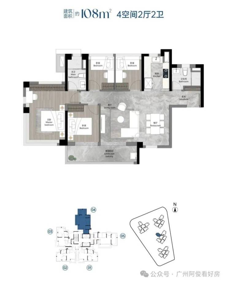 108-122㎡四房:横厅设计,5.95米阳台,主卧270°飘窗,部分户型含步入式衣帽间。