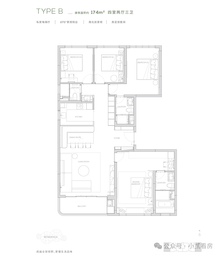 174产品为四房两厅三卫产品,打造了端户边厅布局,形成LDK一体化。无界的室内空间畅游体验,在平淡的日常里体验着生活的华章。
