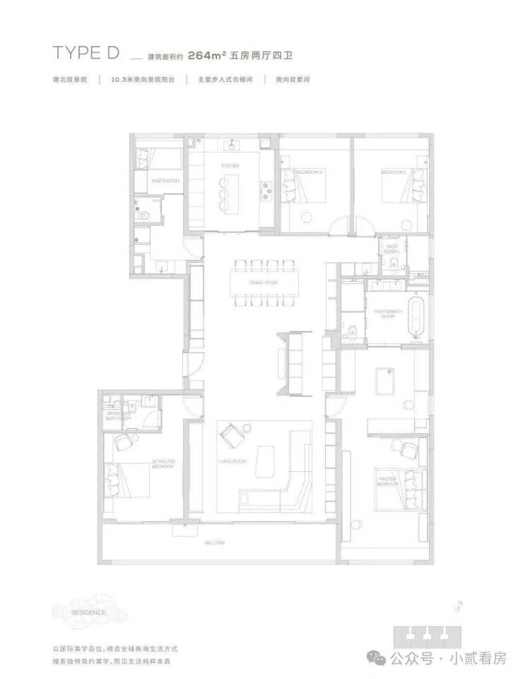 264为五房两厅四卫产品,更细腻的产品设计,超奢华四件套南向主卧,标准南向次主卧, 6.6米巨型方厅,纵向超长LDK一体化空间,专属家政保姆空间,超大容量收纳空间,令居住的尊贵从每处品质细节里流露而出,创造独一无二的奢享体验。