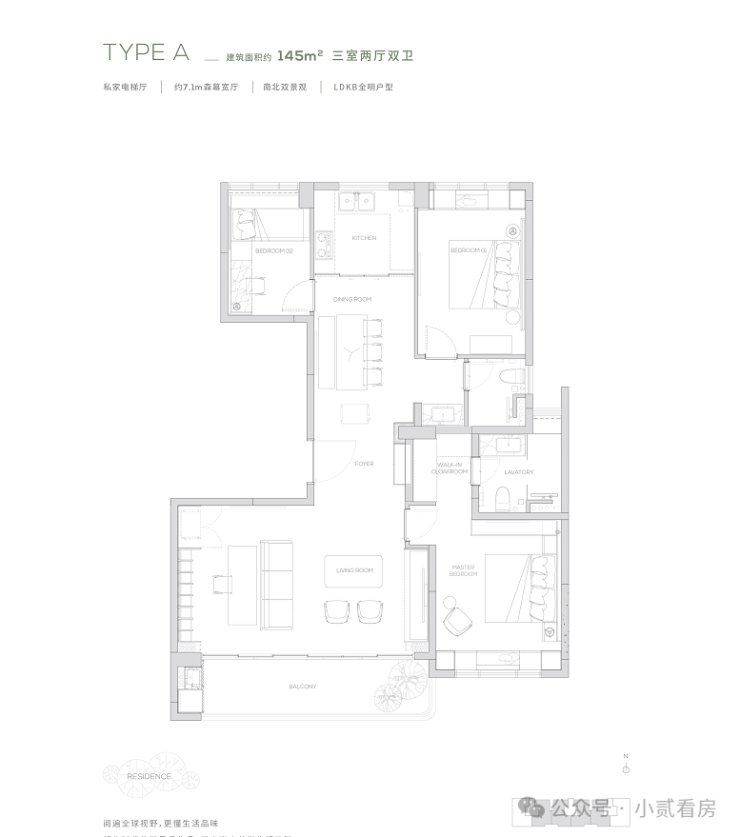 145产品为三房两厅两卫产品,餐厨一体化设计, 7米宽厅可切换各种生活场景,畅享宽幕般景观界面。