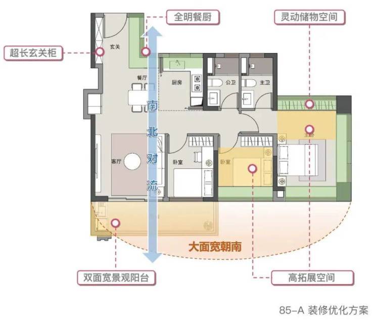 85平户型(1栋):2房2厅2,玄关一侧带L型飘窗,四开间朝南,三卧室都朝南,主卧三面采光三面飘窗,可以把其中1面飘窗改成衣柜。