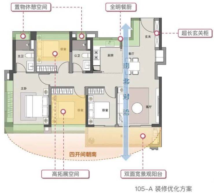 105平户型(1、2栋):(3+1)房2厅2卫,布局和85平相似,也是四开间朝南,阳台连通客厅与次卧,不同的是,北向有个卧室夹在公卫与主卫中间。