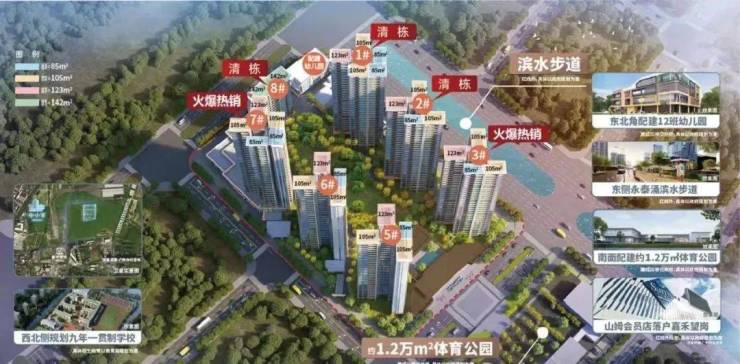 配建约6000㎡社区服务中心(卫生服务、颐康等)项目自建1所12班幼儿园 南面配建1.2万㎡体育公园东侧政府规划永泰涌滨水步道