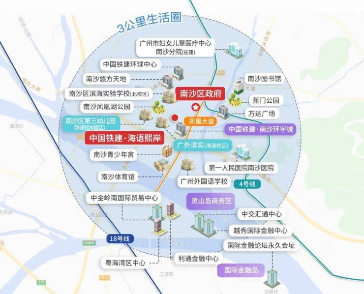中国铁建·海语熙岸组团,紧邻凤凰湖,背靠大山乸森林公园,生态湖居大境呼应着南沙中芯贵重的土地,在向湖而生的灵感中构筑与湖共居的空间场域。且临近城市主干道,交通便捷。(不过存在高速噪音影响)