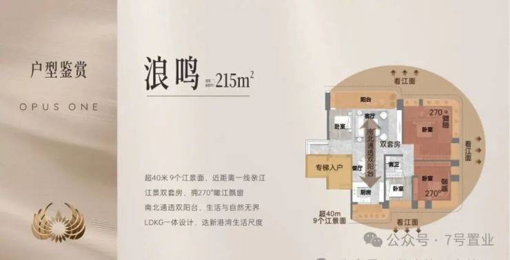 产品创新:项目主力户型为131-290㎡三至五房,采用“点阵式错位布局”,楼间距高达120米。以215㎡户型为例,层高3.3米,全景落地窗设计,搭配“双主卧+双会客厅”格局,满足家族多代共居的私密性与尊贵感。