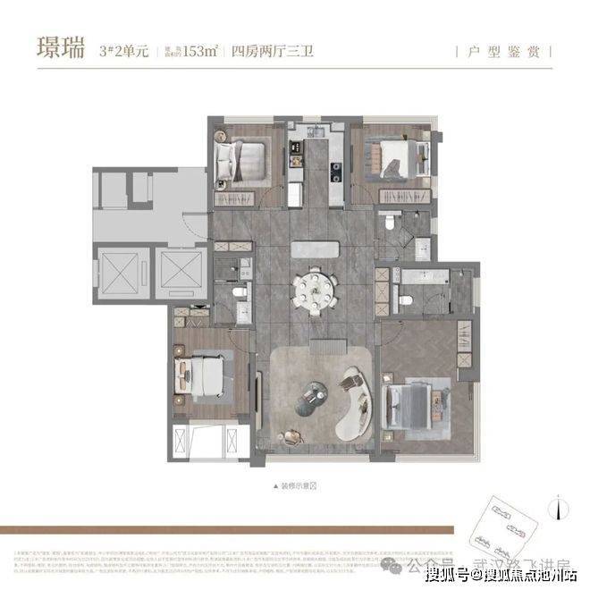 ③153平户型,四房两厅三卫:位于3号楼东边户,不仅实现南北通透,还具备三面采光优势,同时规划有三开间朝南的布局,采用 “四叶草” 结构设计。这种布局让室内面积利用率更高,且各个卧室之间互不打扰,但美中不足的是动静分区效果较弱,主卧与客厅相邻。该户型配备独立电梯前室,有两个卧室能拥有270°景观视野,大概率也搭配了双面飘窗。不过需注意,南向次卧的卫生间为暗房,且南向次室外侧设有空调机位,根据户型图显示,可能会对采光造成一定遮挡(实际影响需以现场情况为准),此外餐厅位于户型中部,采光条件相对较弱。