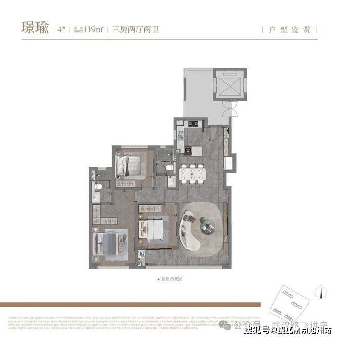 ①119㎡户型:三房两厅两卫:位于2、4号楼的中间户位置,户型为南北半通透设计,北侧房间对着连廊,这会对居住私密性产生一定影响。整体结构比较常规,该户型的主要优势在于相对更低的总价,且配备双开门电梯,即便作为中间户,也拥有独立的电梯前室。