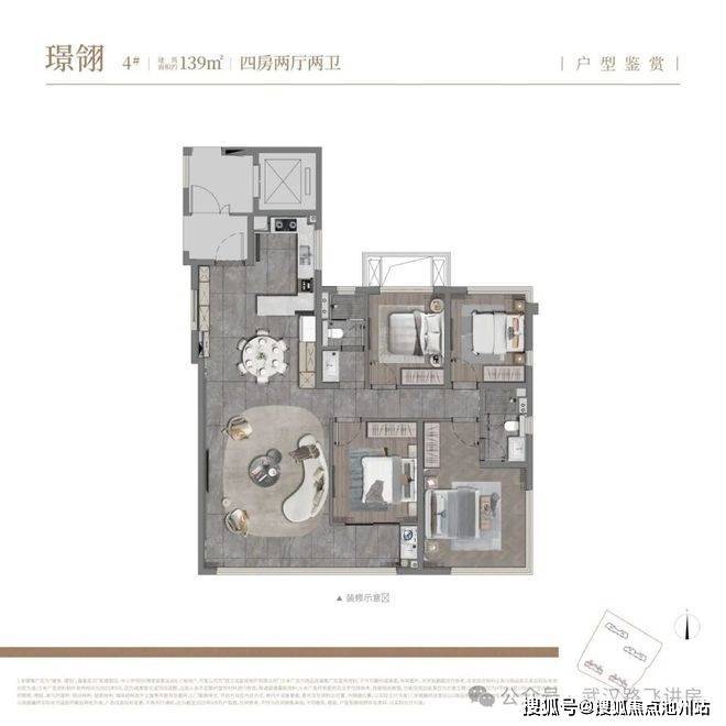 ②139平户型,四房两厅两卫:位于2、4号楼的端头边户,户型做到南北通透,且有三开间朝南的设计,整体结构相对常规。该户型配备独立电梯前室,并且电梯前室额外增设了一道门用于隔离。建面约139㎡的空间能规划出四房布局,功能性表现较强。值得一提的亮点是主卧带有全景舱两面拐角飘窗,不仅优化面积较多,采光效果也不错;不过受飘窗布局影响,卧室床的摆放会受限,大概率需要对着主卧门口放置。