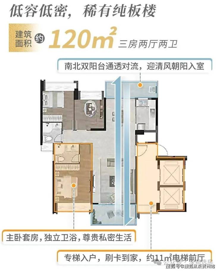 6 栋为 17 层,两梯两户板楼, 120 m²精装三房两厅两卫。
