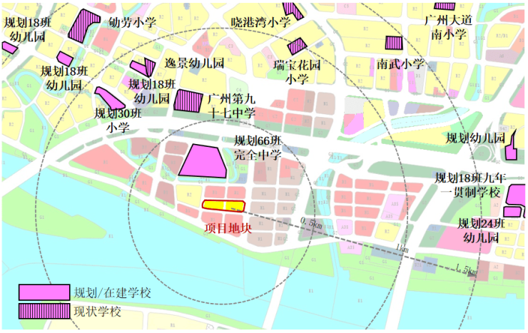 1千米范围内有广州第九十七中学,1.5千米范围内有南武小学等,距离地块