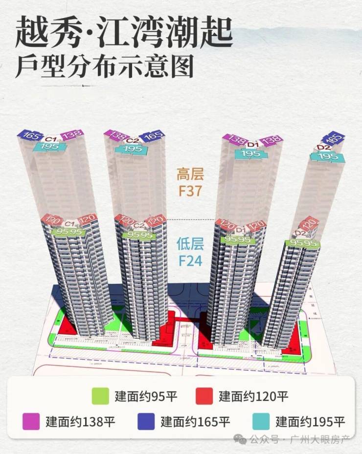 项目共规划4栋住宅楼,均为37层,分高低区设计,而且梯户比跟户型都各不相同: