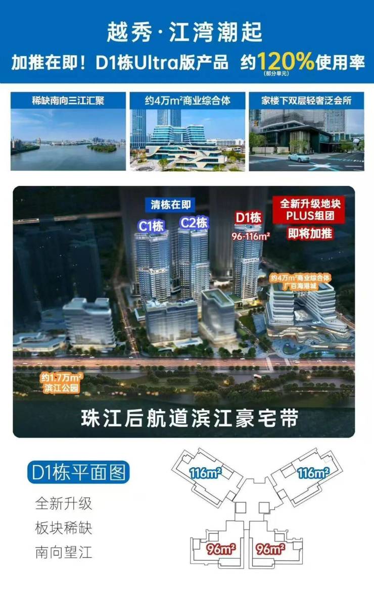 旁边的广百海港城已在2023年12月12日正式封顶,预计在今年底正式开业,它是广州首个大型的滨江海港城,集商务办公、休闲购物、酒店于一体,计划引进奢侈品牌旗舰店、生态写字楼、五星级酒店等业态。家门口解决吃喝玩乐,给项目加分不少。